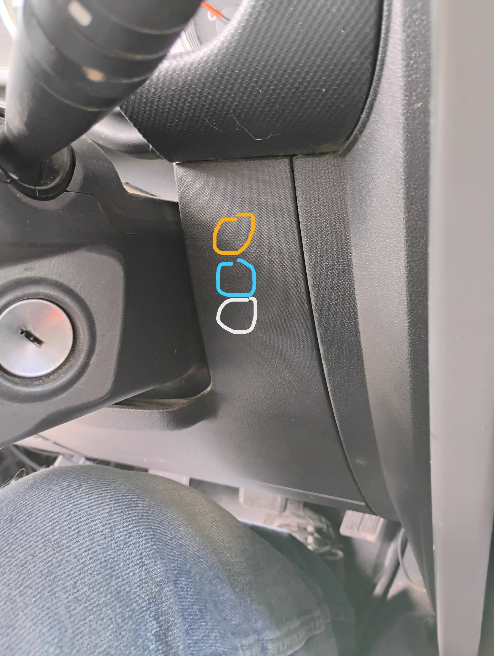 Ok, a few pictures this time. 1st, where I wanted my switches and a secondary location that won't work, and an alternative location, not ideal, but they will mount there. This is where I wanted them, but this is a printed circuit behind these locations. The alternate location will be beside the steering column, behind the key. Circles represent where they will go. I pulled the panel loose, and they will work as long as I start down about an inch or so. sorry for huge images - still learning this site. View attachment 129199