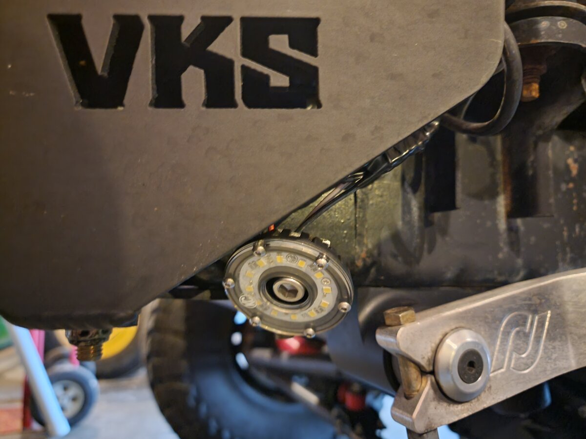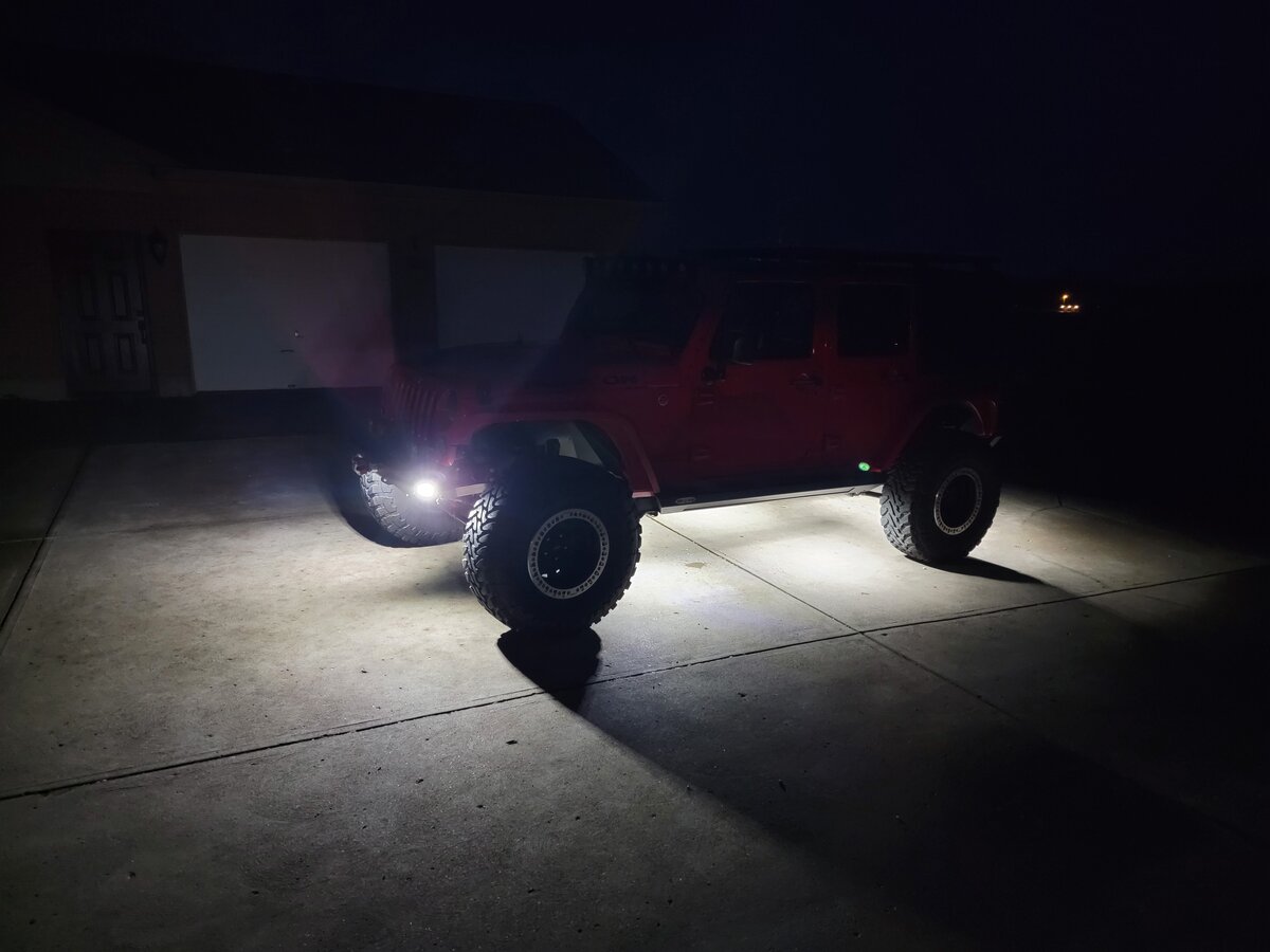 Just finished up adding some rock lights and chase lights tonight. Sadly, I have had these rock lights mounted for a few months. I just never took the time to wire them up. I have 8 of the KC Cyclone clear lights underneath. I took some pictures with my head lights off so I could see exactly how much light I was getting. They light things up pretty well.