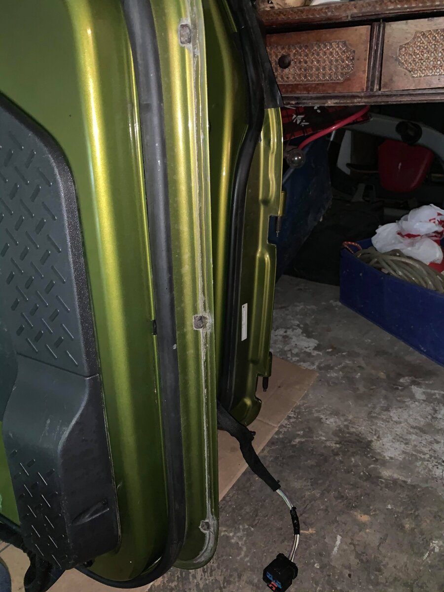 Open the door and look between the weatherstripping and the outer skin of the door panel. My front doors have 3 each 5/8" x 3/8" holes. 1 on the hinge side, 1 in the middle and one on the latch side. The photo shows the driver's side bottom left, or latch side, of the door. The black on top is the weatherstrip, the seam below the hole is the rolled and welded seam of the exterior door panel to the tub of the door. The back doors, because the bottom edge of the door is pretty short, only have 2 holes each.