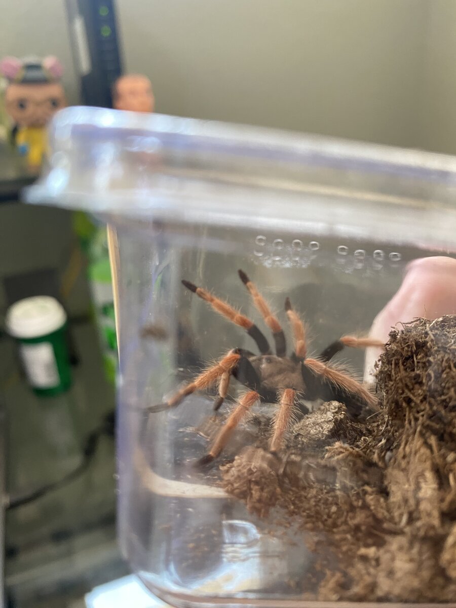 It's a Mexican Fireleg Tarantula. It's about 3" across the legs right now, but they tell me it will grow to 5-6".