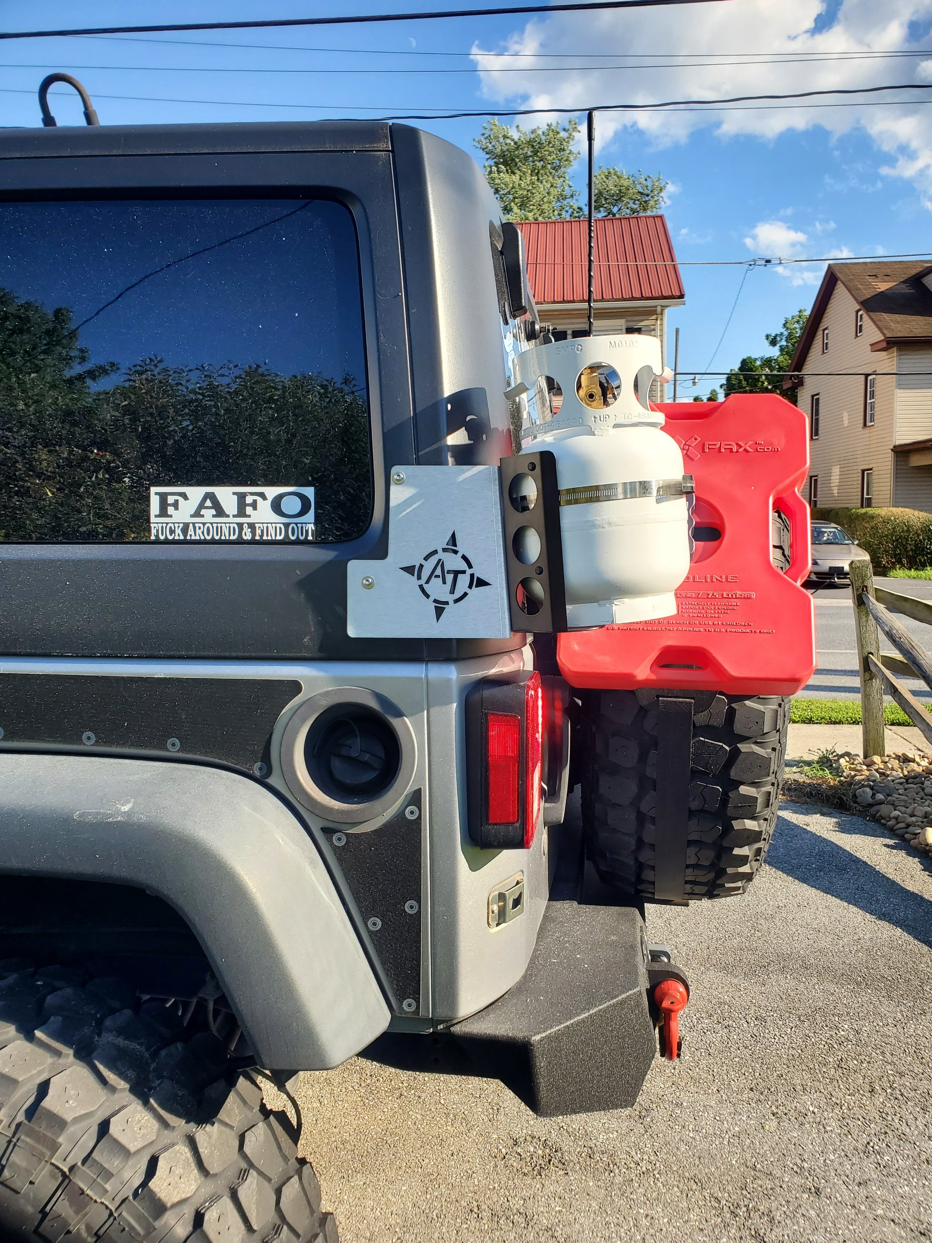 Gearing up for an overlanding trip and decided I was done with the 1lb propane bottles. Installed the AT Overland Jk mount with the Flameking 5lb propane bottle and mount. Still deciding if I want to powder coat the AT mount black or not.